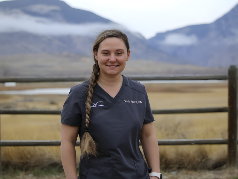 Dr. Danielle Flowers is a lifelong animal lover who knew she wanted to be a veterinarian from the age of five. She grew up in rural northern Illinois, where she developed a strong passion for horses and spent much of her childhood either in the saddle or shadowing veterinarians throughout the region. Dr. Flowers graduated from Aurora University in 2018 with a degree in Biology and was accepted into veterinary school immediately after. In 2022, she earned her Doctor of Veterinary Medicine degree from the University of Illinois College of Veterinary Medicine and moved to Wyoming shortly after graduation, eager to be closer to the mountains.